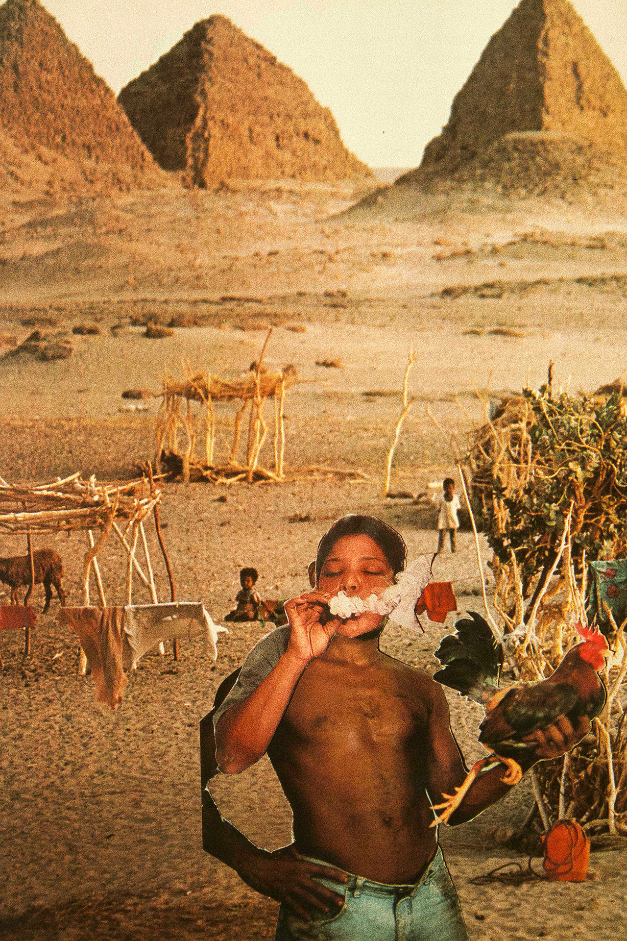 The two first encountered each other in Maseru before either had begun their formal artistic practice, a meeting that would later prove foundational to their understanding of creative possibility within and beyond Lesotho’s cultural landscape. Toeba’s practice, deeply informed by their legal scholarship and anthropological sensibilities, interrogates the “instruments of authority” – law, archives, religion – that sustain political power structures. Through their collage work, they propose alternative realities by uprooting images from mass-produced media, creating what they describe as “reconstructed hallucinations” that challenge dominant narratives.