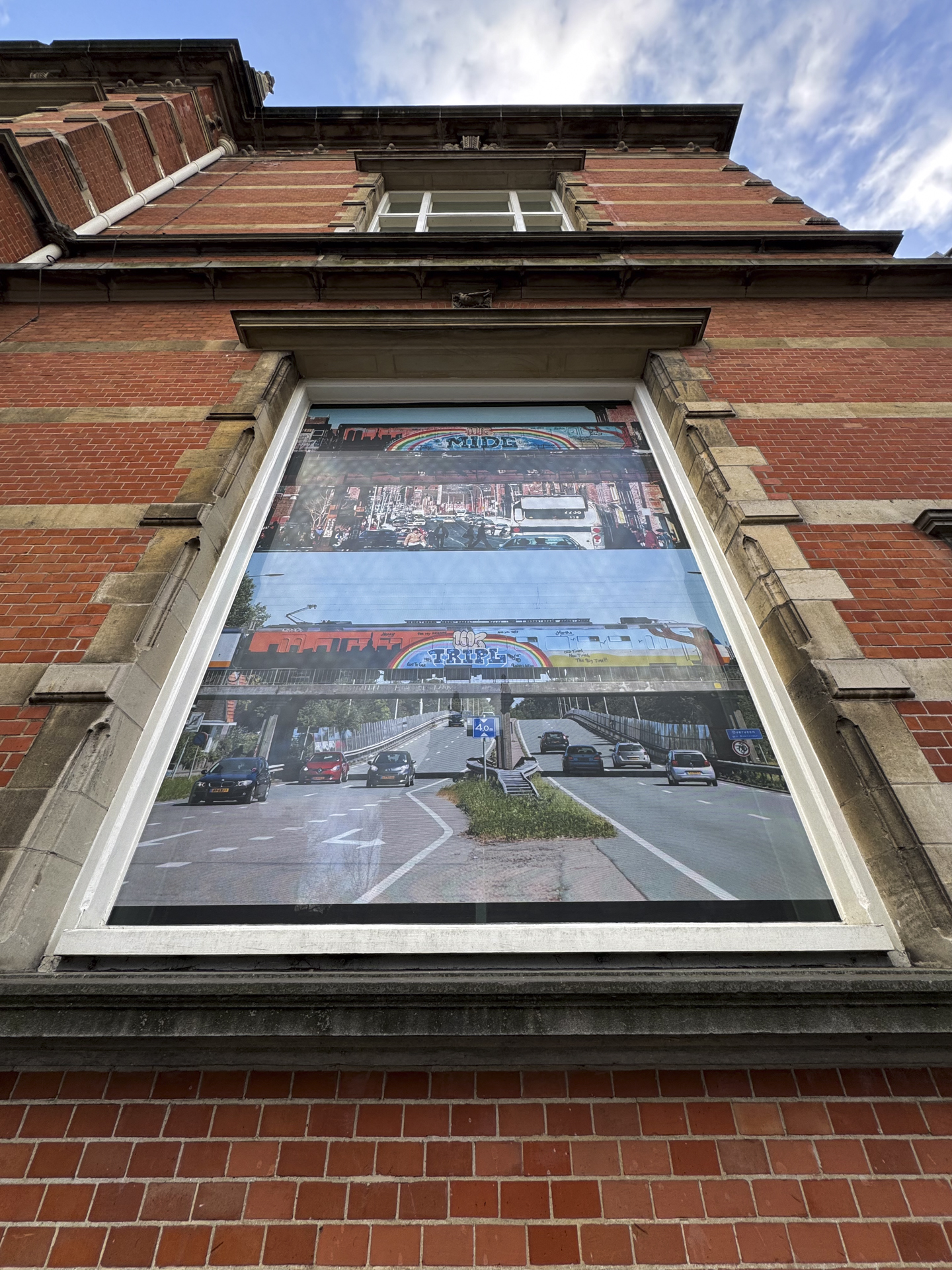On one side of Buro Stedelijk’s Studio Space windows, you see a photo by Martha Cooper ‘Midg, 1983. Passing over St. Ann Street, South Bronx.’ on top, and bellow ‘Tripl, 2018. Passing over Westelijke Randweg, Haarlem.’ by Dear.